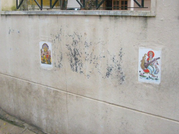 I was informed that some people go for a more subtle approach to discouraging this practice.  They put images of deities on their fences in the hope that people won’t pee in front of the pictures: