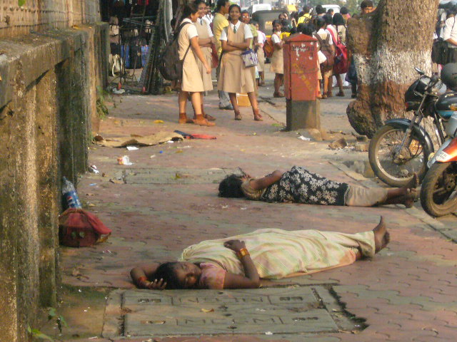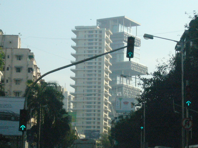 The building in the background with the balconies is reputed to be the most expensive house in the world today–worth US $1 billion.  It has more floor space than the palace of Versailles.  It is home to a family of six.  The family has a staff of 600 which means that each person in the family has 100 people looking after them.  It is truly wretched excess, especially when not too far away you see sights like this: