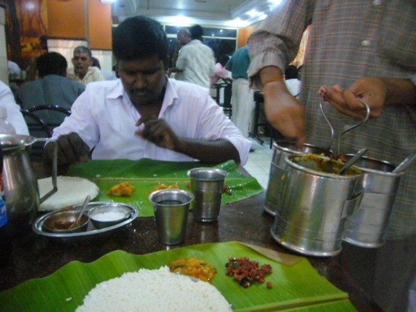 Moving on to a more pleasant topic, this might be a good time to talk a little bit about south Indian food.  We made it a point to go to local restaurants for lunch and dinner.  Most people in south India are vegetarians and in many places instead of a plate you get a banana leaf.  The waiters (all men) come out with pots of different kinds of food and you indicate which ones you want.  They serve you the ones you want directly on the banana leaf.  The locals mix everything up into a sort of paste and eat with their fingers.  Most restaurants we visited had a wash basin near the door so you can wash your hands before you leave.  Here is Vilva showing us how it’s done: