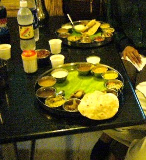 The food is very good.  There will be rice and several different sauces and dishes, all heavily spiced.  Sometimes instead of on a banana leaf it is served in separate containers, called a thale: