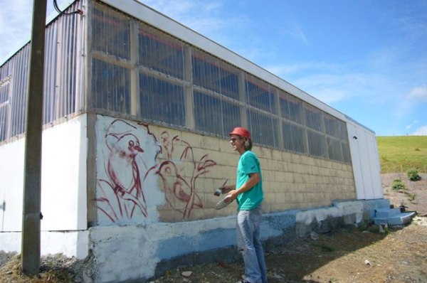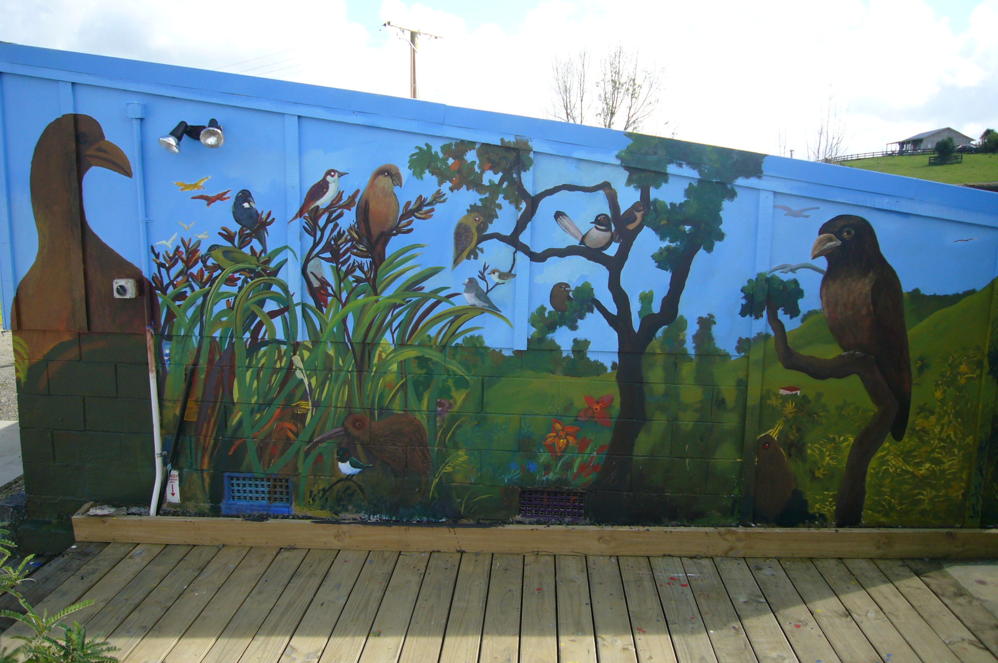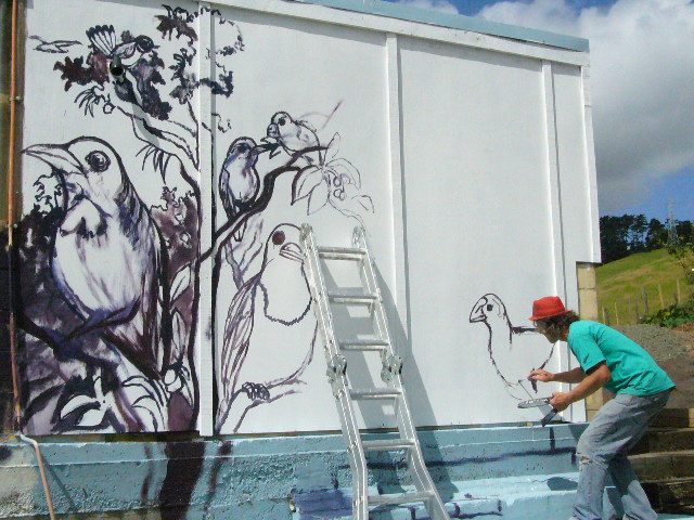 So my wife and I came up with another idea. Because our whole project is about restoring the old grazing pastures to native forest and creating a habitat for native birds, we decided to decorate the nursery with a nature mural featuring native New Zealand birds and vegetation. Plus, not to sound obsessive, but it seemed to me that painting giant birds on the side of the building might further discourage real birds from taking up residence.
