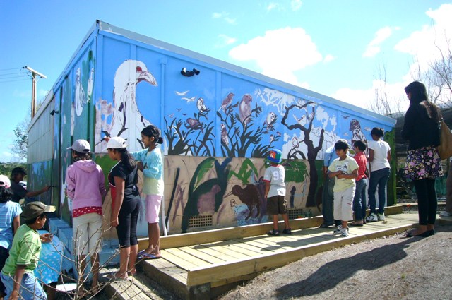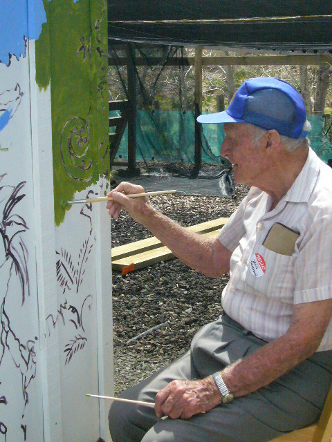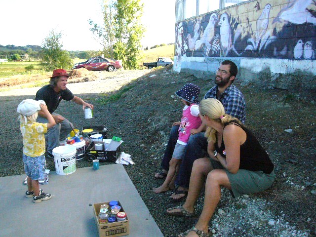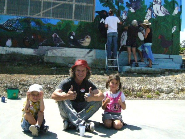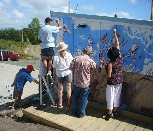 The mural took shape amazingly quickly. Some people tackled the sky, others the trees and bush and some adopted a bird or two. Doug passed around a dog eared and paint encrusted Guide to New Zealand Birds so the that volunteers could see the actual colors of the birds they were working on. Speaking of colors, the paint for the project was generously donated by Resene, a major manufacturer of paints in Australia and New Zealand.