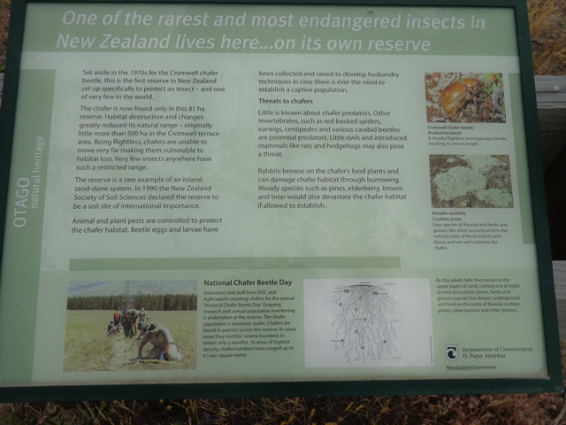 Before leaving Cromwell we visited New Zealand’s only bug reserve.  The Chafer beetle lives only in New Zealand and is considered critically endangered.  Like native birds, the beetles don’t fly and therefore are sitting ducks for introduced predators.  In 1983 a 200 acre field was set aside to protect the beetles and at the time was the only reserve in the world created for an invertebrate.