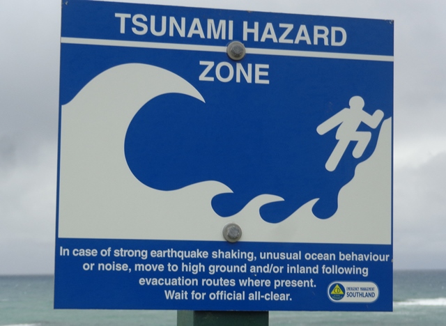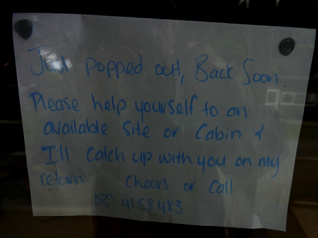 Late in the afternoon we arrived at Pounawea which is located where the Catlin River flows into the ocean.  There is no town to speak of, just a few houses and the camp ground where we stayed.  When we arrived the office was closed and this sign had been taped to the door: