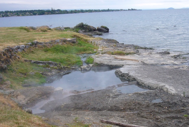 Lake Taupo is actually the caldera crater of a monstrous volcano that erupted about 27,000 years ago.  It was supposedly the largest volcanic eruption in history and it has affected the geology of the entire country, covering the soil with several feet of volcanic ash and changing the course of rivers.  The lake is 616 square kilometres (238 square miles) and is the size that Singapore was before they started making Singapore bigger by reclaiming land.