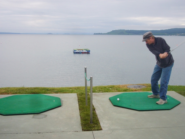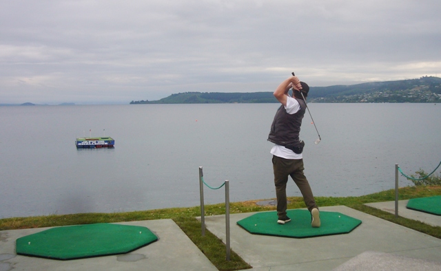 He was running the Lake Taupo Hole in One project.  On the platform in the lake are three holes with the smallest being a regulation sized golf hole.  If you get a hole in one you win $10,000 and there are lesser prizes for getting the ball in the larger holes or even for getting the ball on the platform.  Divers go out to retrieve the balls.  And the occasional club.