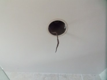 Ascending the ladder and making sure I wasn’t positioned directly underneath, I took out the light bulb. I tugged at the fixture while holding a bucket underneath. The fixture slid out easily and there was nothing there!