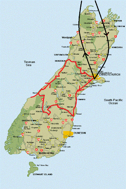 The plan was to fly in and out of Christchurch, pick up a car and head west. This was our route:
