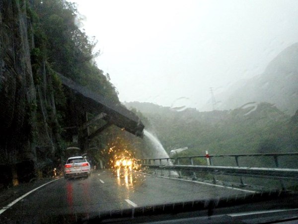 This is at the pass, you can see the amount of water coming off the rain guttering over the road.