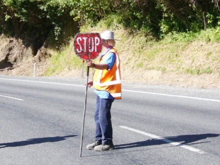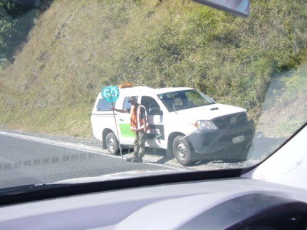 We were the first car in line and decided to have a chat with the guy.  He responded by playing the air guitar with his stop sign and coming over to the car.  His colleague was having a morning snack: