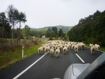 Sheep on the road don’t realize that they are on a road.  In fact, they like to take it slow in order to assure themselves that there is nothing to eat there.  The intellect of a sheep is such that they take a lot of convincing that asphalt roading is not edible.   They are oblivious to your presence and the only thing that moves them along is the sheep dogs or the farmer, if he’s around.