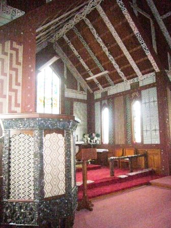 The visit proved as cathartic as a visit to one of the great Gothic cathedrals.  It was an Anglican church built in 1924 by local Maori.  The walls are woven panels and the ends of each bench were individually and uniquely carved by local artists.  The stained glass was also done by local artists.