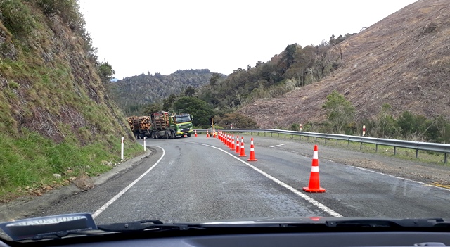 We enjoyed the irony of waiting for a log truck at one of the slip sites.