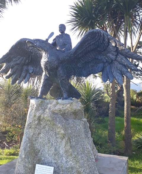 The sculpture is a representation of the Haast’s eagle which is an extinct eagle that had a wingspan of eight feet and a four inch beak. These eagles actually existed and there are legends of them flying off with little Maori children. Their primary prey was the moa which was like a 12 foot tall ostrich. The statue depicts Te Maia, a real person who according to the story actually explored the top of the South Island on the back of an eagle.