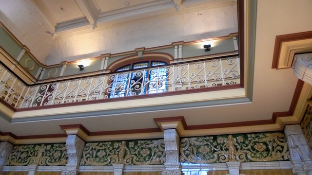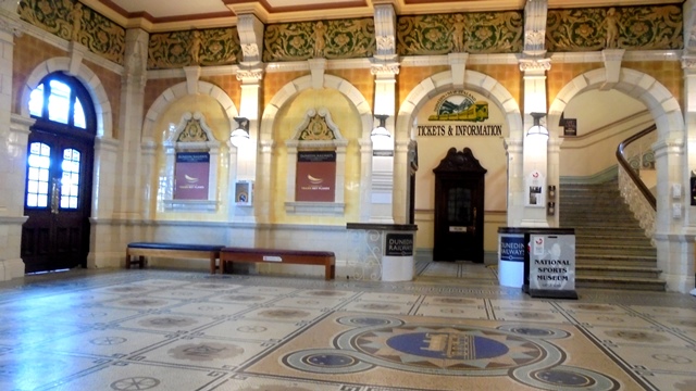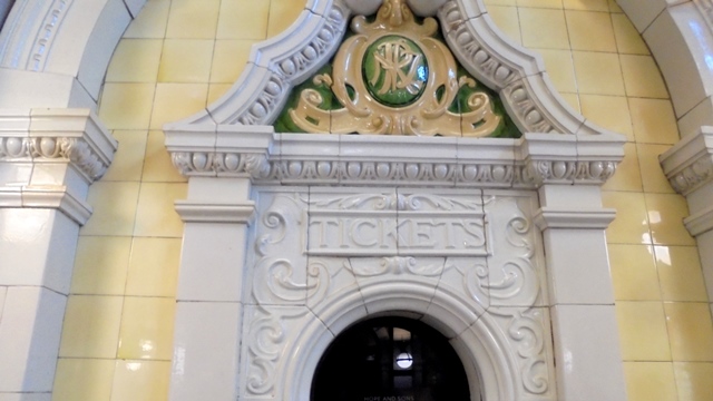 The interior booking hall is covered in Royal Doulton porcelain tiles and has a mosaic floor featuring locomotive designs.