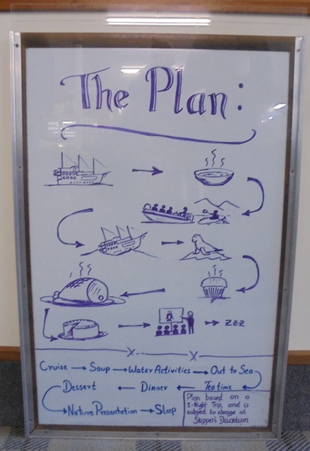 Normally we would have turned around and headed back after about 10-15 minutes but we ended up spending well over an hour drifting around as we were surrounded by a group of four humpback whales. It was impossible to get a good picture of them with our little camera, but we saw them breaching and blowing air. The whale sighting wasn’t on the itinerary and dinner was delayed while the entire crew came out to watch the show.